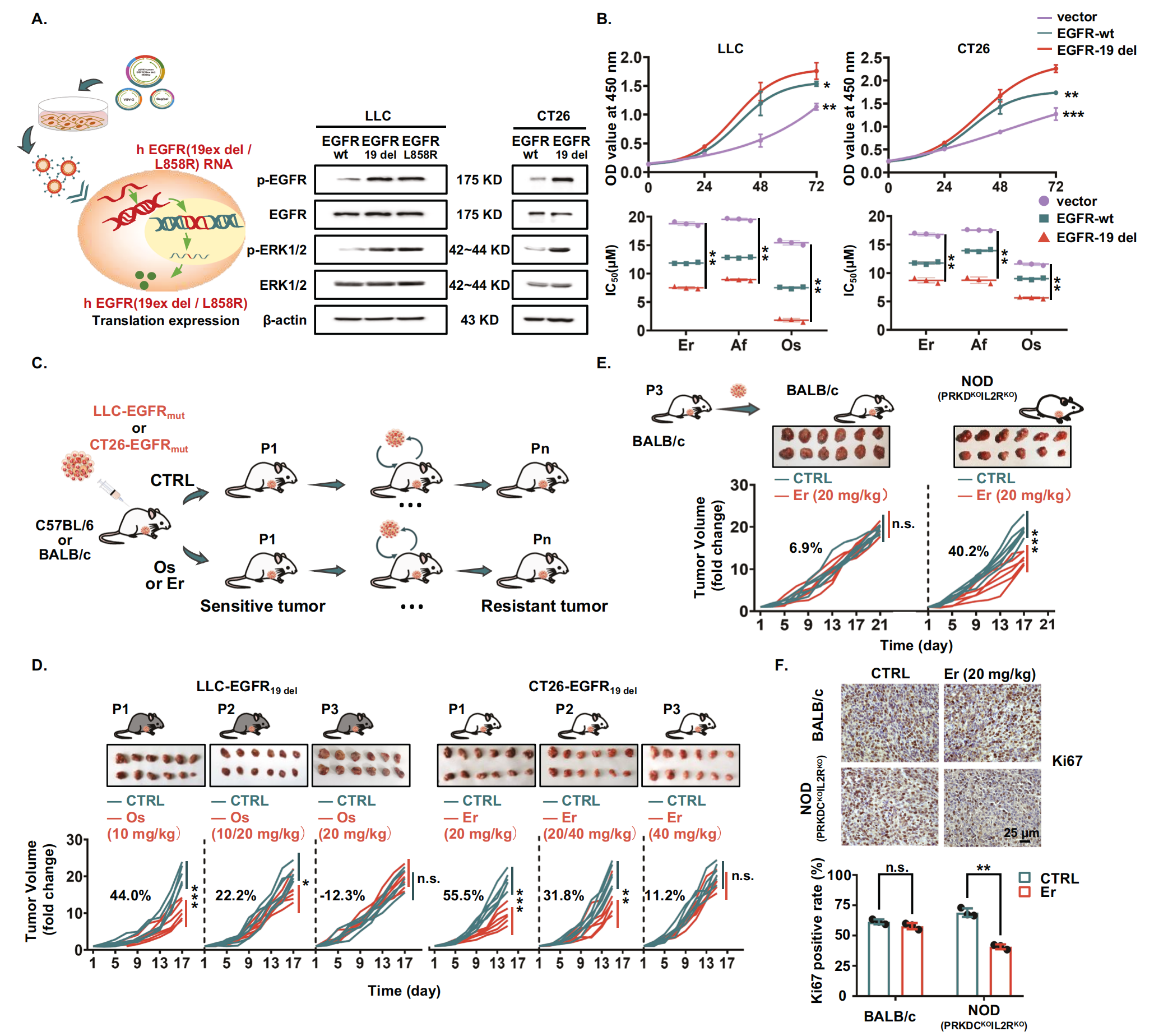 使用攜帶 EGFR 突變的小鼠細胞系建立了異位異種移植腫瘤模型,并評估了對不同代 EGFR-TKI 的反應,揭示腫瘤耐藥機制。