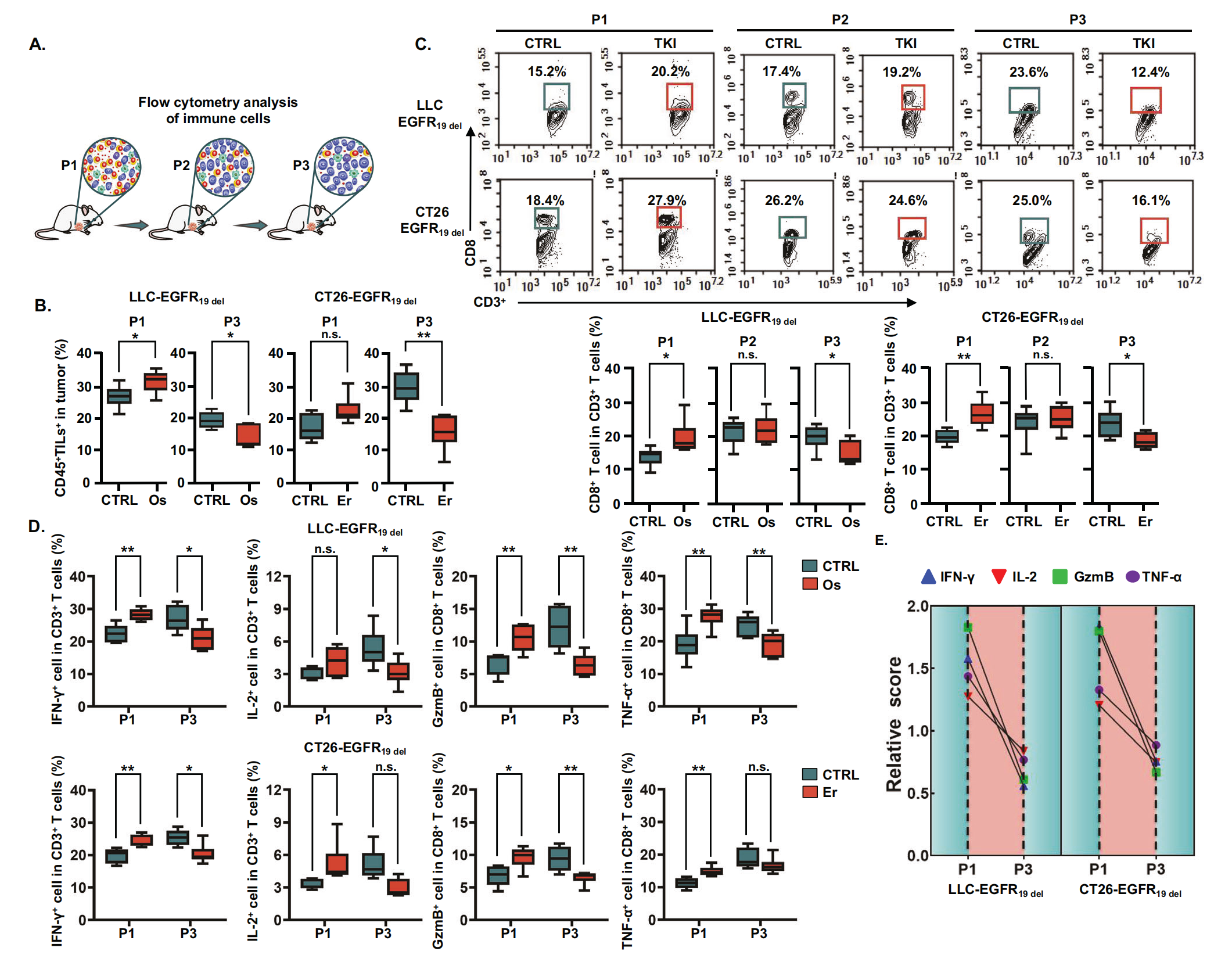 為了了解腫瘤免疫環(huán)境如何參與對 EGFR-TKI 的耐藥性,作者分析了治療過程中不同階段的腫瘤免疫環(huán)境特征(圖 2A)。作者測定了初始 EGFR-TKIs 治療時和耐藥發(fā)展期間 (P1-P3) 腫瘤免疫環(huán)境中腫瘤浸潤白細胞 (TIL) 的密度,其中用鹽水處理的腫瘤細胞作為 CTRL 組,用厄洛替尼或奧希替尼治療的腫瘤細胞作為 TKI 組。流式細胞術分析的免疫分析顯示,在治療早期,攜帶 EGFR19del?的腫瘤的 EGFR-TKIs 治療誘導腫瘤浸潤白細胞比例增加(圖2B)。然而,當荷瘤小鼠對 EGFR-TKI 產生耐藥性時,與 CTRL 組相比,腫瘤浸潤白細胞的比例顯著降低(圖2B)。這表明荷瘤小鼠對 EGFR-TKIs 的反應性改變伴隨著腫瘤免疫環(huán)境的動態(tài)變化。