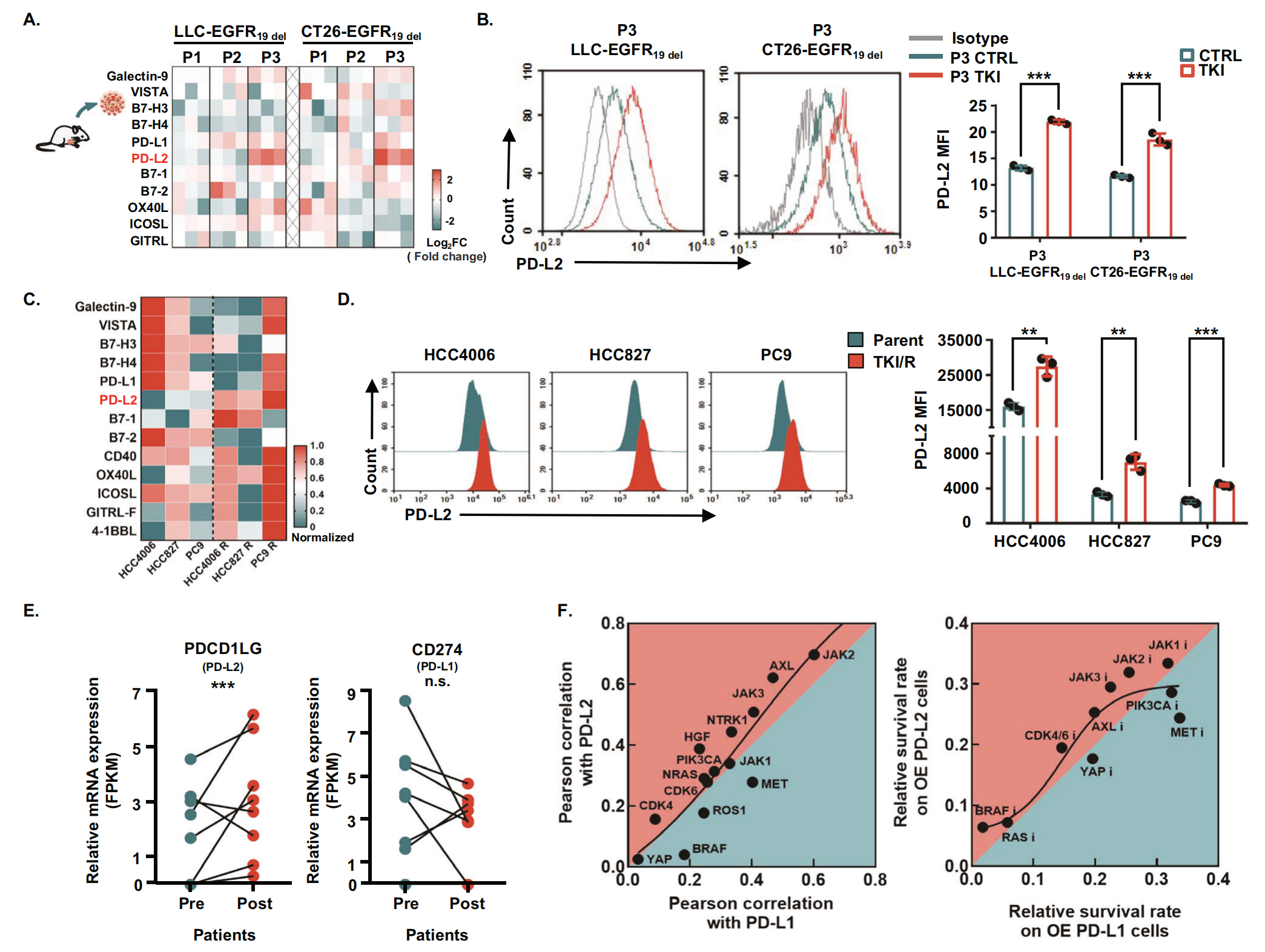 為了探索腫瘤免疫環(huán)境變化的原因,作者同時檢測了不同傳代階段腫瘤組織中刺激性和抑制性免疫調節(jié)分子的表達。在 EGFR-TKI 的初始治療中,一些抑制性免疫檢查點的相對表達降低(圖隨著耐藥性的出現(xiàn),抑制性免疫檢查點基因 PD-L1 和 PD-L2 的相對表達水平逐漸升高,尤其是 PD-L2 (圖3A)。為了進一步驗證 PD-L2 在 EGFR-TKI 耐藥腫瘤細胞中表達的增加,作者通過流式細胞術鑒定了 PD-L2 在 P3 腫瘤細胞厄洛替尼或奧希替尼處理的腫瘤細胞(耐藥,TKI 組)表面的表達,以生理鹽水處理的細胞為對照(敏感,CTRL 組)。作者的結果表明,與對照組織相比,腫瘤細胞表面 PD-L2 的表達在耐藥腫瘤組織中表現(xiàn)出顯著增加(圖3B)。接下來,為了進一步驗證,作者分析了先前構建的 EGFR 突變的 TKI 耐藥 NSCLC 細胞系 HCC4006R、HCC827R、PC9R 及其配對親本細胞中免疫檢查點標志物的表達水平。在三種耐藥細胞系中,PD-L2 的 mRNA 和蛋白表達水平顯著上調,而 PD-L1 的表達表現(xiàn)出不一致的變化(圖3C、D)。
