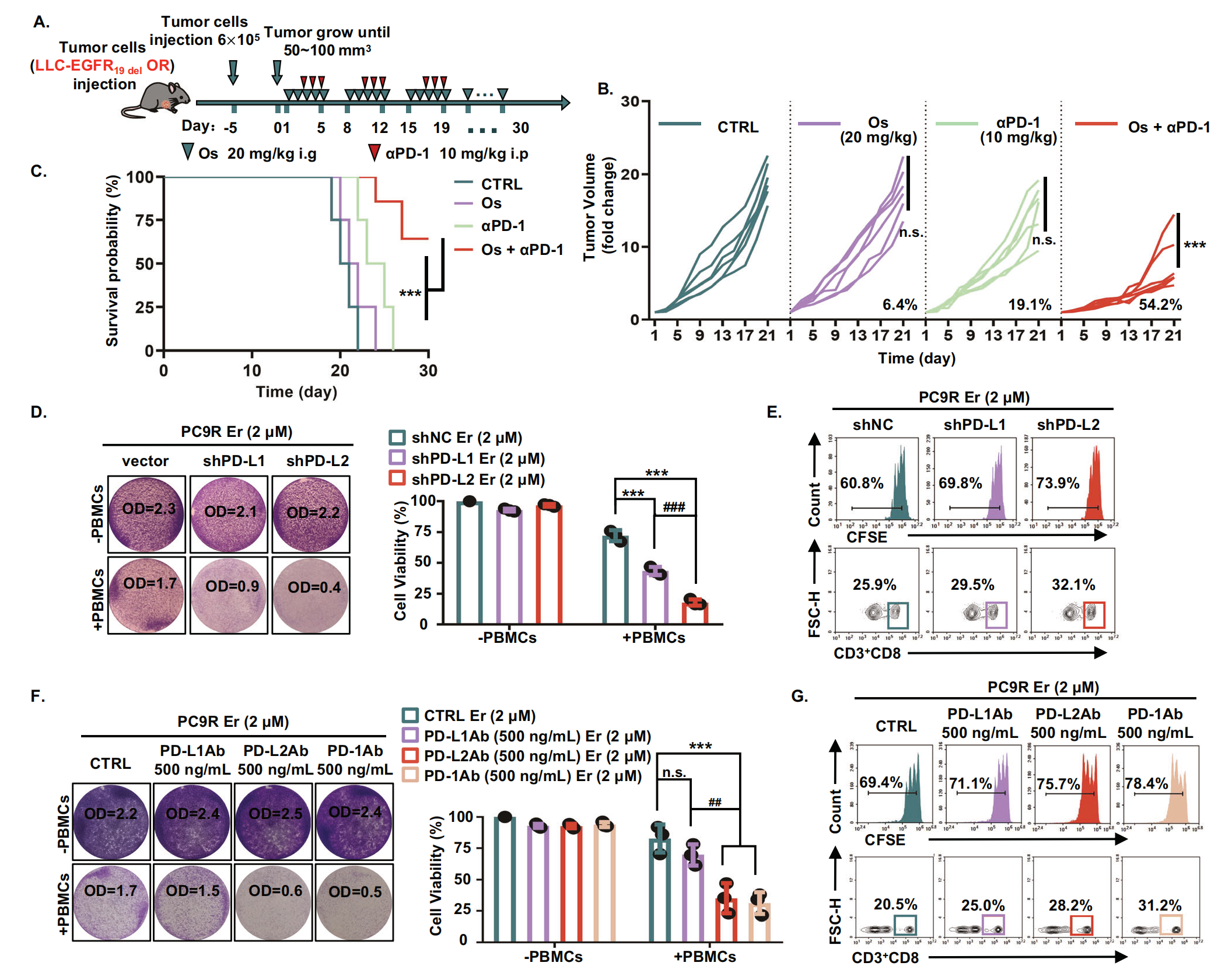接下來,作者想進一步探討阻斷 EGFR-TKI 耐藥細胞中的 PD-L2/PD-1 是否可以通過增強免疫反應來增強腫瘤細胞對 EGFR-TKIs 的敏感性。作者建立了攜帶對奧希替尼耐藥的 LLC-EGFR19del?衍生腫瘤的同基因小鼠模型。小鼠接受生理鹽水 (CTRL)、奧希替尼 (Os)、抗 PD-1 (αPD-1) 和奧希替尼 + 抗 PD-1 (Combi) 治療(圖5A)。作者的結果表明,與 CTRL 組相比,單獨使用奧希替尼組小鼠的腫瘤體積和生存時間沒有顯著差異。PD-1 抑制劑對 EGFR-TKI 耐藥腫瘤表現(xiàn)出部分抑制,并導致小鼠存活時間適度延長,盡管沒有統(tǒng)計學意義。然而,奧希替尼和抗 PD-1 的組合顯著抑制了腫瘤生長并延長了攜帶耐藥腫瘤的小鼠的生存期(圖5B,C)。以上結果表明,抑制 PD-1 與 EGFR-TKI 聯(lián)合有效抑制了 EGFR-TKI 耐藥腫瘤的生長。