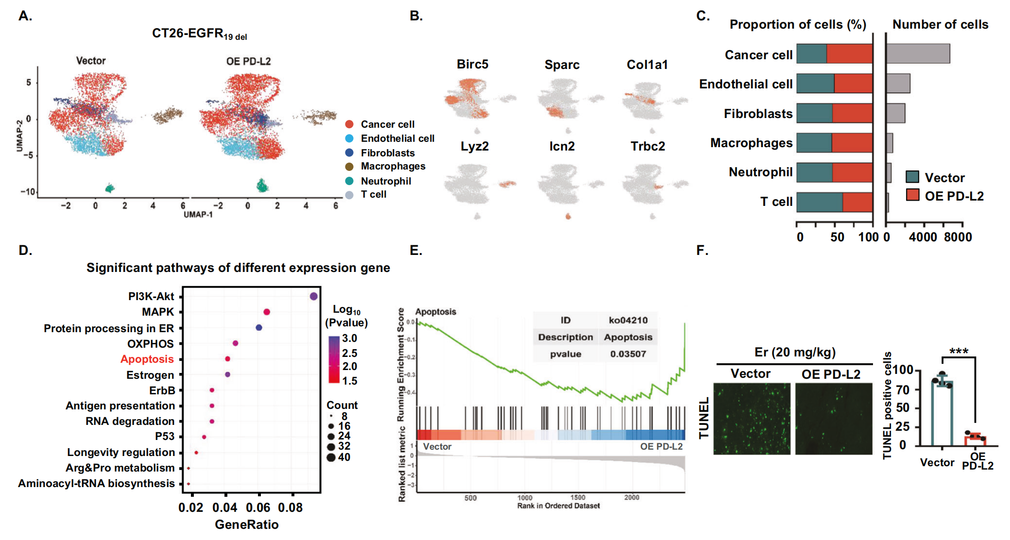 接下來,作者進一步探討了 PD-L2 表達升高影響免疫反應以降低腫瘤對 EGFR-TKIs 敏感性的機制。作者獲得了來自空載體或 PD-L2 過表達的同基因小鼠中 CT26-EGFR19del?細胞的腫瘤組織的單細胞轉錄組譜。作者對來自空載體樣本和 PD-L2 過表達樣本的整合單細胞數據集進行了聚類分析,并確定了六個主要的不同細胞群(圖6A、B)。作者發(fā)現(xiàn) PD-L2 過表達組中癌細胞的數量顯著增加,T 細胞的比例顯著降低(圖6C)。為了探索 EGFR-TKIs 耐藥的機制,作者分析了癌細胞的轉錄組特征。與空載體組相比,對 PD-L2 過表達組的差異表達基因進行 KEGG 富集分析。作者觀察到細胞凋亡通路顯著富集(圖 6D)。GSEA 分析顯示,PD-L2 過表達組癌細胞中與細胞凋亡途徑相關的基因顯著下調(圖6E)。這些結果表明,EGFR 突變腫瘤細胞中 PD-L2 表達的增加可導致細胞凋亡減少。作者的體內實驗數據進一步驗證了這些結論。TUNEL 染色顯示,與對照組相比,TKI 處理后 CT26-EGFR19del?PD-L2 過表達組腫瘤細胞凋亡受到顯著抑制(圖6F)?;谶@些結果,作者假設 EGFR 突變的腫瘤細胞中 PD-L2 表達增加會抑制癌細胞的凋亡,從而導致癌細胞的持續(xù)生長,耐藥性增加。