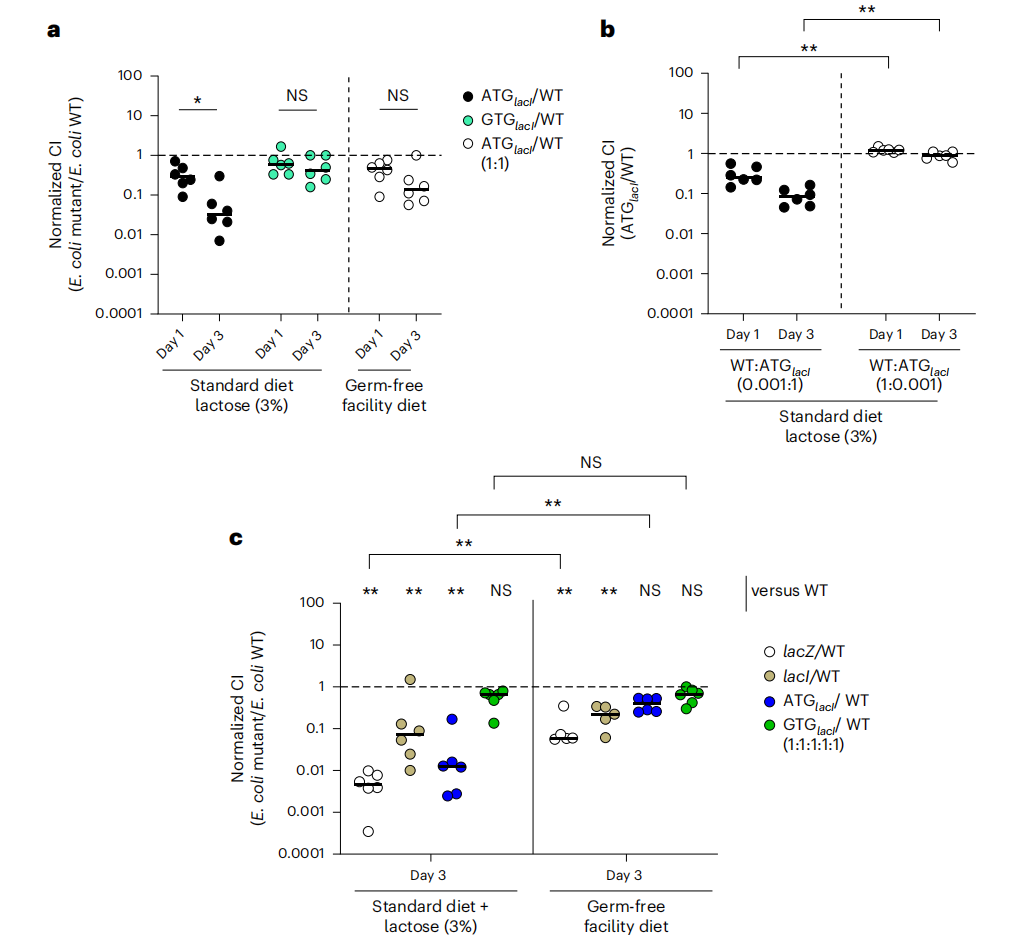 研究人員在不同的小鼠模型和飲食條件下,比較了 lacZ 突變體菌株的適應性。結(jié)果顯示,在不同條件下,lacZ 突變體菌株的適應性表現(xiàn)出差異,這表明 lacI GTG 起始密碼子的優(yōu)勢是上下依賴性的。例如,在無菌小鼠中,lacZ 突變體菌株的生長劣勢更加明顯,這表明腸道微生物群可能對 lacZYA 操縱子的活性產(chǎn)生影響。此外,不同飲食中乳糖含量的差異也可能影響 lacZ 突變體菌株的適應性。