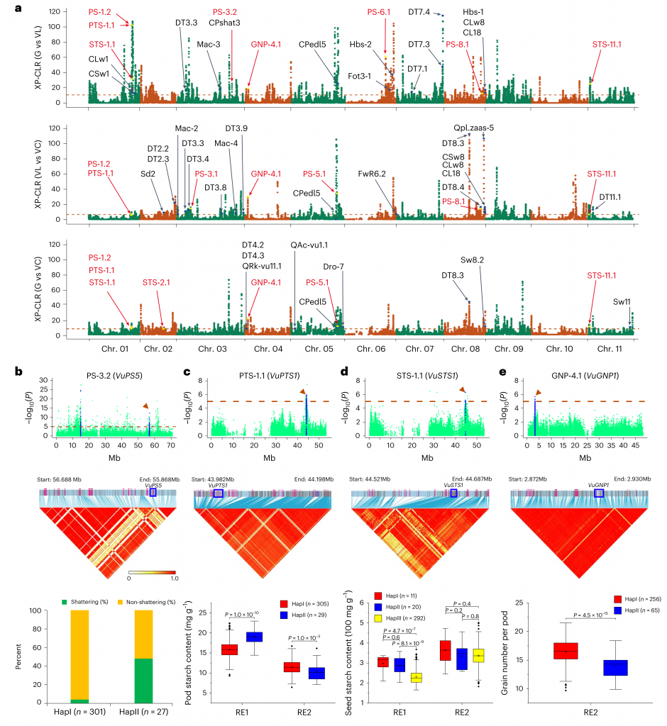 為了研究自然或人工選擇對豇豆分化的影響,作者通過選擇清除分析比較了三個豇豆亞群之間的基因組選擇特征,鑒定出239個與豇豆馴化和改良相關(guān)的基因。此外,通過GWAS,挖掘到裂莢性、莢長、單莢粒數(shù)、千粒重、可溶性糖、總淀粉和粗蛋白質(zhì)含量相關(guān)基因,并在遺傳群體中驗(yàn)證。同時揭示了兩個亞種之間基因組結(jié)構(gòu)變異(SVs)的全圖譜,為豇豆在全基因組選擇下的馴化與改良提供了見解。產(chǎn)量性狀和品質(zhì)性狀的差異基因組選擇將有助于建立糧用豇豆和菜用豇豆雙向改良的遺傳資源。