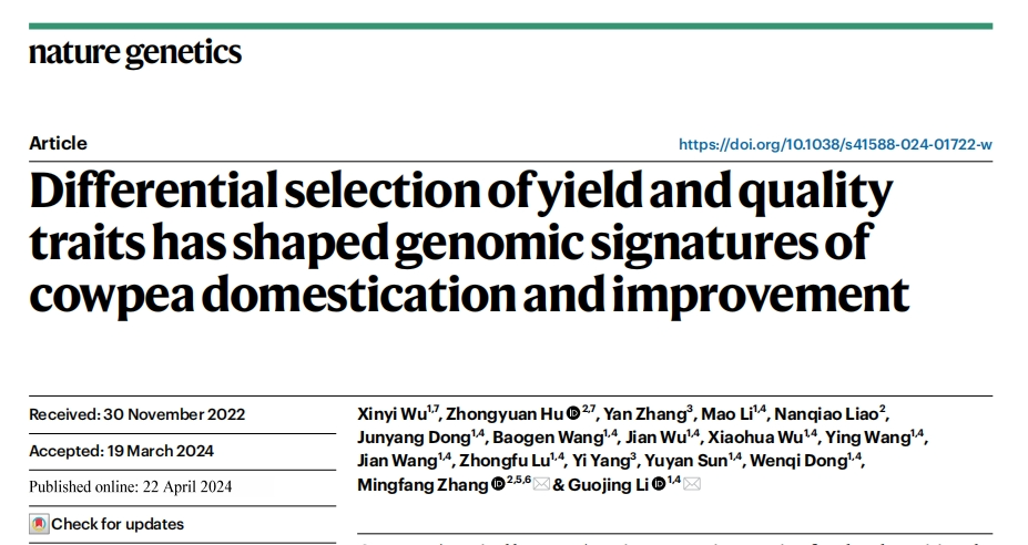 實(shí)驗(yàn)方法:菜用豇豆G98,糧用豇豆G323 基因組Denovo;重測序GWAS:344份全世界收集的豇豆核心種質(zhì),其中包括342份栽培豇豆(87份糧用豇豆、244份菜用豇豆和11份未知用途豇豆)和2份野生豇豆;Illumina測序,10x深度;基因單倍型驗(yàn)證:菜用豇豆地方品種 ‘ZN016’ 和菜用豇豆育成品種‘Zhijiang282構(gòu)建的RIL群體(183 lines)G98和G323構(gòu)建的F2群體(165 individuals)
