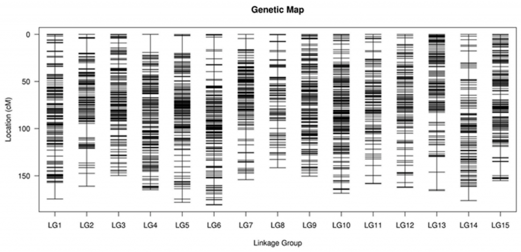 甘薯作為一個全球重要的作物,其含有豐富的營養(yǎng)成分以及對不同環(huán)境的適應(yīng)能力。然而,由于其自交不親和,高雜合度等特性,使其遺傳特征的研究相對較少。作者從Xin24×Yushu10雜交中選擇212個F1材料,SLAF-seq測序,獲得親本26.73×,子代52.25×的測序數(shù)據(jù),依據(jù)SNP及百邁客生物自主研發(fā)的HighMap構(gòu)圖軟件,生成一個長度為2441.56 cM、平均圖距為0.51 cM的遺傳圖譜。