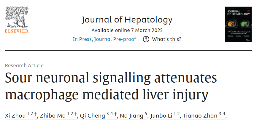 2025年3月,華中科技大學(xué)同濟(jì)醫(yī)學(xué)院附屬同濟(jì)醫(yī)院器官移植研究所蘭培祥教授、陳知水教授和肝臟外科程琪教授研究團(tuán)隊(duì)在Journal of Hepatology發(fā)表題為”Sour Neuronal Signalling Attenuates Macrophage Mediated Liver Injury”的研究論文。研究使用單細(xì)胞轉(zhuǎn)錄組測序技術(shù)等多種技術(shù),深入闡述人鼠中減輕肝缺血再灌注損傷的腦-肝軸調(diào)控通路,發(fā)現(xiàn)酸味刺激竟然可以通過神經(jīng)信號(hào)緩解肝臟損傷!這一發(fā)現(xiàn)不僅為肝臟疾病的治療提供了新思路,還從現(xiàn)代科學(xué)的角度驗(yàn)證了中醫(yī)“酸入肝”的理論。