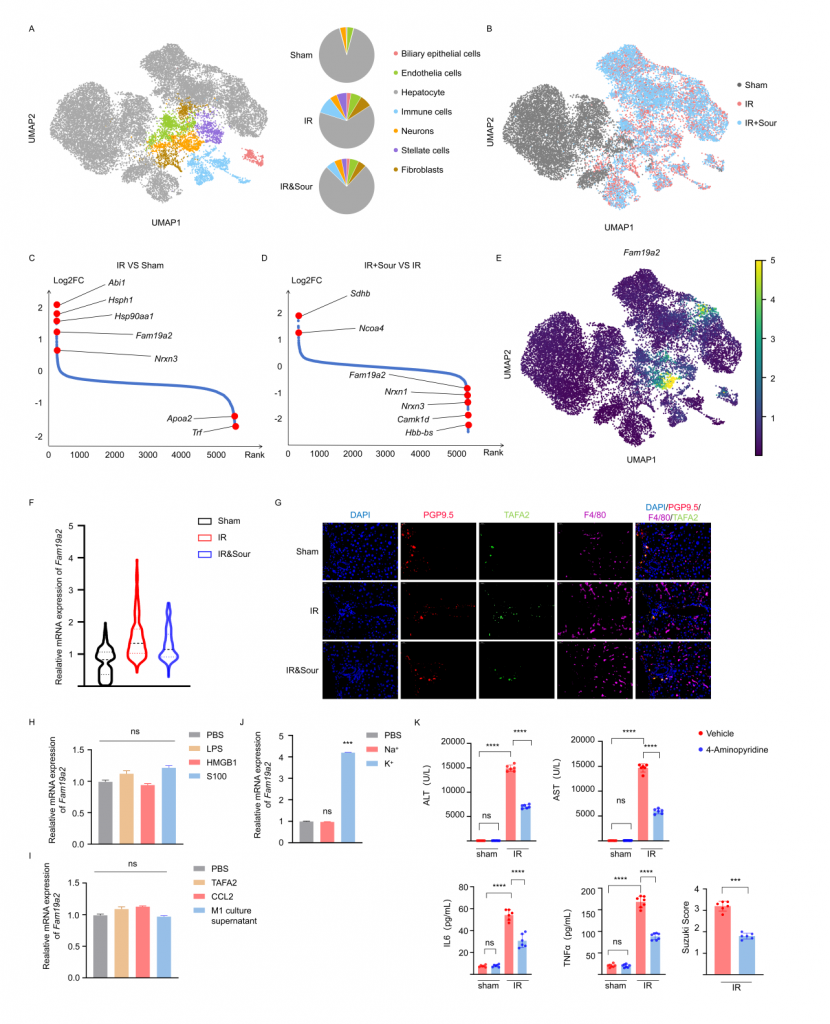 對(duì)肝IRI小鼠、酸刺激后肝IRI小鼠及sham(假手術(shù))小鼠的肝臟和CG進(jìn)行單細(xì)胞核轉(zhuǎn)錄組測序,結(jié)果顯示IRI引起肝細(xì)胞和神經(jīng)元基因表達(dá)譜發(fā)生變化,IRI肝中免疫細(xì)胞數(shù)量增加,但酸刺激后IRI樣本中免疫細(xì)胞數(shù)量減少。神經(jīng)元較為特異性地表達(dá)TAFA2,IRI可引起肝神經(jīng)元TAFA2表達(dá)水平增加,但酸刺激使得TAFA2表達(dá)水平降到與sham對(duì)照組相近水平。實(shí)驗(yàn)發(fā)現(xiàn)鉀離子可引起小鼠海馬神經(jīng)元細(xì)胞系HT22顯著高表達(dá)TAFA2,使用鉀離子通道抑制劑可減輕肝損傷,支持酸刺激通過神經(jīng)系統(tǒng)減輕肝損傷的假設(shè)。進(jìn)一步的,使用慢病毒敲低神經(jīng)元TAFA2表達(dá)水平或使用TAFA2敲基因鼠,發(fā)現(xiàn)IRI引起的肝組織損傷、巨噬細(xì)胞浸潤以及血清標(biāo)志物水平降低,表明TAFA2在肝IRI中有著重要作用。