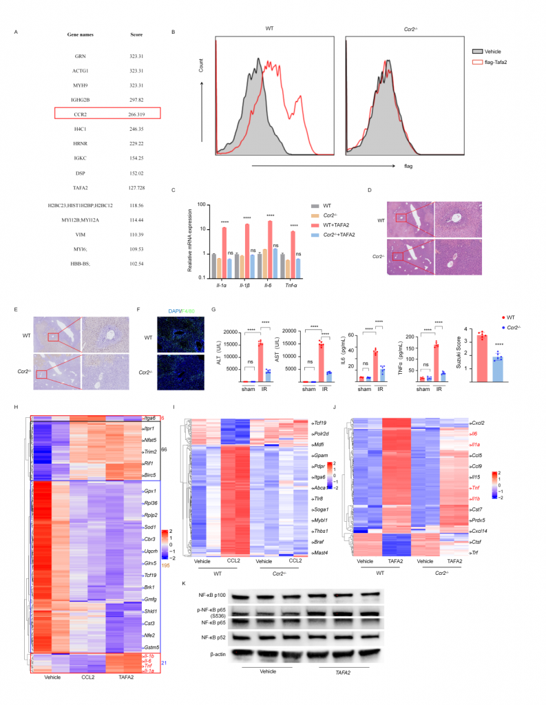 體外實(shí)驗(yàn)表明巨噬細(xì)胞上的CCR2是TAFA2受體,CCR2敲除小鼠IRI肝的組織損傷以及巨噬細(xì)胞浸潤降低,血清標(biāo)志物水平降低。TAFA2或CCL2刺激后BMDM的bulk RNA-seq數(shù)據(jù)表現(xiàn)出幾乎一致的轉(zhuǎn)錄組表達(dá)譜,粘附、代謝、Ras信號(hào)通路相關(guān)差異基因表達(dá)上調(diào),代謝和核糖體通路相關(guān)基因表達(dá)下調(diào),TAFA2誘導(dǎo)BMDM更高的表達(dá)Il1α,Il1β,Il6,Tnfα以及干擾素相關(guān)基因,促進(jìn)巨噬細(xì)胞介導(dǎo)的炎癥響應(yīng)。進(jìn)一步實(shí)驗(yàn)表明TAFA2促使巨噬細(xì)胞介導(dǎo)的炎癥響應(yīng)主要依賴CCR2,但巨噬細(xì)胞上也可能存在其他的TAFA2受體。