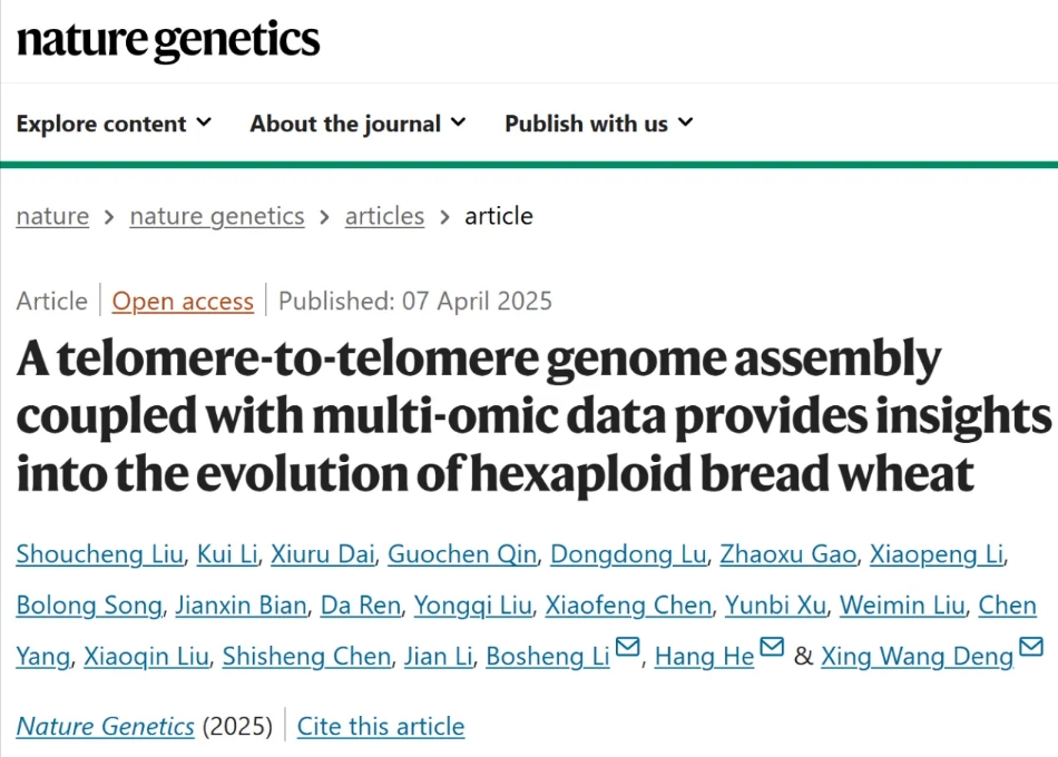 2025年4月7日,濰坊現(xiàn)代農(nóng)業(yè)山東省實驗室/北京大學現(xiàn)代農(nóng)業(yè)研究院和小麥育種全國重點實驗室鄧興旺、何航、李博生團隊在國際頂尖期刊《自然-遺傳學》(Nature Genetics)上發(fā)表題為“A telomere-to-telomere genome assembly coupled with multi-omic data provides insights into the evolution of hexaploid bread wheat”的突破性成果:成功繪制了六倍體小麥的端粒到端粒(T2T)完整基因組圖譜,實現(xiàn)了小麥基因組從“頭”到“尾”無缺口的精確組裝。這一在山東完成的成果,為我國主糧作物高水平科技自立自強、牢牢把握糧食安全主動權(quán)提供了重要支撐。