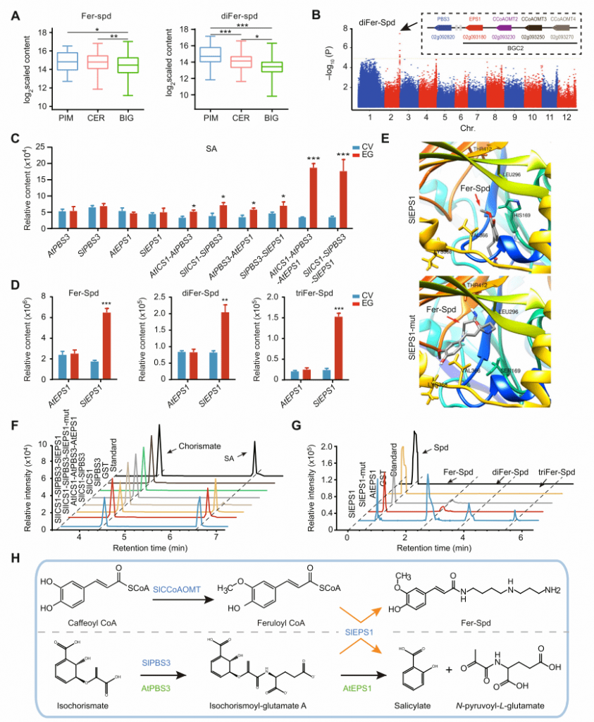 該研究對401份番茄群體材料的酚胺物質(zhì)進行了檢測,通過基于代謝物全基因組關(guān)聯(lián)分析(GWAS)鑒定出2號染色體上與酚胺合成基因簇(BGC2)。實驗證明基因簇中核心組分SlEPS1參與水楊酸和酚胺的生物合成,其關(guān)鍵氨基酸殘基 His169對酚胺合成至關(guān)重要,且SlEPS1的雙酶活性與增強的抗病性相關(guān)(圖1)