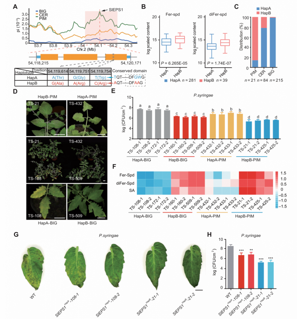 通過比較不同番茄亞群中SlEPS1位點的核苷酸多樣性,發(fā)現(xiàn)該基因可能受人工選擇影響。變異組分析發(fā)現(xiàn)番茄群體間有兩個不同的SlEPS1單倍型組合:SlEPS1HapA和SlEPS1HapB,其中SlEPS1HapB的植株中酚胺和SA水平更高,抗病性更強。這些結(jié)果表明,在番茄的馴化選擇過程中,SlEPS1HapB的消失可能是導(dǎo)致番茄抗病性降低的原因之一(圖2)。