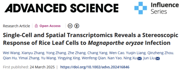 2025年3月24日,中國(guó)農(nóng)業(yè)大學(xué)植物保護(hù)學(xué)院劉俊團(tuán)隊(duì)在國(guó)際綜合性期刊《Advanced Science》上,在線發(fā)表了題為“Single-Cell and Spatial Transcriptomics Reveals a Stereoscopic Response of Rice Leaf Cells to?Magnaportheoryzae?Infection”的研究長(zhǎng)文,該研究利用單細(xì)胞核轉(zhuǎn)錄組測(cè)序和空間轉(zhuǎn)錄組測(cè)序技術(shù),深度分析了水稻-稻瘟菌互作下的細(xì)胞空間立體響應(yīng),并構(gòu)建了一個(gè)全新的水稻-稻瘟菌互作單細(xì)胞和時(shí)空組轉(zhuǎn)錄圖譜。