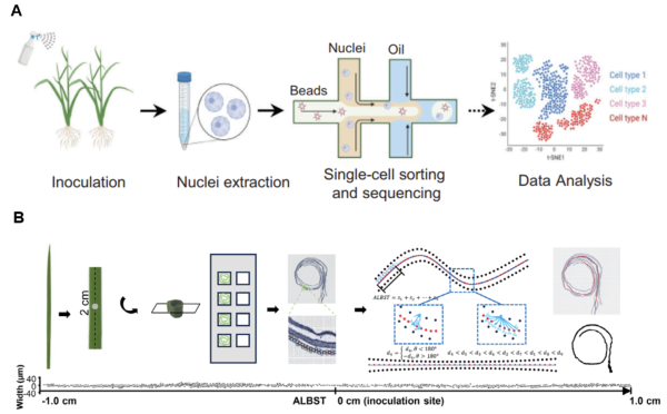 單細(xì)胞組學(xué)和時(shí)空組學(xué)是近年來(lái)生命科學(xué)領(lǐng)域的重要技術(shù)突破,它們?cè)诩?xì)胞異質(zhì)性解析、動(dòng)態(tài)過(guò)程研究和細(xì)胞間相互作用分析方面具有重要優(yōu)勢(shì),為生命科學(xué)研究帶來(lái)了全新的視角和深度。水稻稻瘟病是世界上發(fā)生嚴(yán)重的真菌病害之一,水稻在面臨稻瘟菌侵染時(shí)會(huì)激活動(dòng)態(tài)免疫,因此挖掘水稻特異免疫基因?qū)τ诳沟疚敛【秩局陵P(guān)重要。
