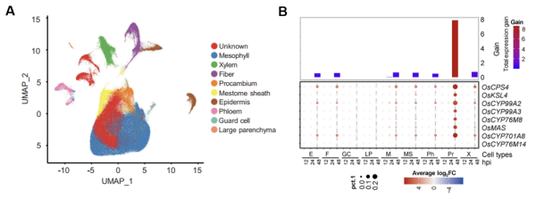 對(duì)測(cè)序獲得的單細(xì)胞數(shù)據(jù),結(jié)合細(xì)胞特異的標(biāo)志基因,AddModuleScore?軟件和GO富集分析等方法,對(duì)水稻的細(xì)胞類型進(jìn)行了分類注釋(圖2A)?;虮磉_(dá)分析發(fā)現(xiàn),維管細(xì)胞中的原形成層細(xì)胞在稻瘟菌侵染后高度誘導(dǎo)二萜類植保素合成代謝相關(guān)基因的表達(dá),其中水稻關(guān)鍵植保素momilactone A合成被特異誘導(dǎo)(圖2B),促進(jìn)了momilactone A在維管組織中積累,可能是抗稻瘟病的關(guān)鍵因素。相反,激素途徑和模式分子激發(fā)的免疫對(duì)抗病性貢獻(xiàn)較弱。