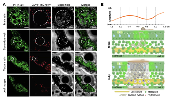 共聚焦顯微鏡觀察結(jié)果顯示,稻瘟菌孢子萌發(fā)后優(yōu)先靶向葉脈入侵,但是水稻的維管組織具有較強(qiáng)的免疫,稻瘟菌菌絲無(wú)法進(jìn)一步侵入(圖3A)。時(shí)空組測(cè)序結(jié)果顯示,富含亮氨酸重復(fù)序列的(NLR)免疫基因的表達(dá)在接種24小時(shí)后,葉尖部較葉基部具有更強(qiáng)的積累,表明免疫基因的表達(dá)具有極性的特征。綜上所述,該項(xiàng)研究揭示了水稻在稻瘟病菌侵染時(shí)免疫基因存在細(xì)胞特異性和多維(局部和縱向)的表達(dá)模式,為挖掘新的免疫基因提供了重要的數(shù)據(jù)基礎(chǔ)(圖3B)。