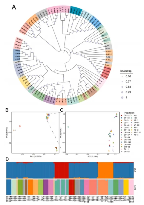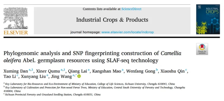 2025年4月2日,Industrial Crops & Products在線發(fā)表了由四川省林草局、四川大學(xué)生命科學(xué)學(xué)院王婧教授課題組聯(lián)合中南林業(yè)科技大學(xué)等多家單位合作完成的研究論文,題為” Phylogenomic analysis and SNP fingerprinting construction of Camellia oleifera Abel. germplasm resources using SLAF-seq technology”。該研究利用SLAF-seq技術(shù),對(duì)四川省主栽的來自我國南方25個(gè)主要油茶品種開展了系統(tǒng)發(fā)育和群體基因組學(xué)研究,并篩選關(guān)鍵SNP標(biāo)記構(gòu)建了DNA指紋圖譜。該指紋圖譜的構(gòu)建有望為我國南方尤其是四川地區(qū)油茶種質(zhì)資源保護(hù)、開發(fā)利用及品種選育提供關(guān)鍵科學(xué)依據(jù)。