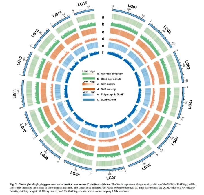 經(jīng)測(cè)序,每個(gè)樣本平均測(cè)序深度為13.95×,共鑒定出470,397個(gè)多態(tài)性SLAF標(biāo)簽,并初步檢測(cè)到36,317,329個(gè)SNP位點(diǎn),經(jīng)過質(zhì)控過濾后,最終保留了5,685,673個(gè)高質(zhì)量SNP供后續(xù)分析。這些SNP廣泛分布于油茶基因組的各個(gè)染色體區(qū)域,具有較強(qiáng)的代表性和應(yīng)用潛力,為油茶的遺傳多樣性研究和分子育種提供了寶貴的遺傳資源。 Figure 2展示了SNP位點(diǎn)在各染色體上的分布密度、覆蓋深度和變異質(zhì)量參數(shù),為后續(xù)的遺傳結(jié)構(gòu)分析及品種識(shí)別提供了堅(jiān)實(shí)的基礎(chǔ)數(shù)據(jù)支持。