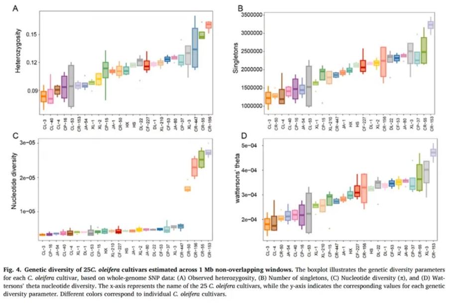 為了全面評(píng)估油茶種質(zhì)資源的遺傳多樣性,研究統(tǒng)計(jì)了包括雜合度(Heterozygosity)、核苷酸多樣性指數(shù)(π)、單態(tài)位點(diǎn)數(shù)量(Singleton)以及Watterson’s θ值等關(guān)鍵遺傳參數(shù)(Figure 4)。結(jié)果表明,川榮(CR)系列品種(如CR-153、CR-55)在各項(xiàng)遺傳變異指標(biāo)上均表現(xiàn)出較高水平,尤其是核苷酸多樣性指數(shù)(π)顯著高于其他品種。具體而言,singleton在長林(CL)系列品種(如CL-3、CL-4、CL-40)、翠屏(CP)系列(如CP-16)和江安(JA)系列品種(如JA-54)中較少,而在川榮CR-153和CR-55中則為最多(Figure 4B)。核苷酸多樣性(π)值的差異也較為顯著,川榮品種CR-50、CR-156、CR-55和CR-153的π值明顯高于其他品種,表明川榮系列品種具有較高的遺傳多樣性,可能為油茶品種改良和分子育種提供重要的遺傳資源(Figure 4C)。類似地,Wattersonθ分析進(jìn)一步揭示了品種間分離位點(diǎn)的變化,川榮CR-153、湘林XL-3和CR-55表現(xiàn)出較高的θ值,與singleton的趨勢(shì)一致(Figure 4D)。近交系數(shù)(F)分析結(jié)果與遺傳多樣性模式一致,顯示川榮CR-156、CR-55和CR-447的F值最低,表明其遺傳多樣性較高,而長林CL系列品種(如CL-3、CL-40、CL-4)的F值較高,反映其遺傳多樣性較低??傮w而言,遺傳多樣性分析結(jié)果表明,長林(CL)系列品種由于長期的人工選育和馴化,遺傳背景較為單一,表現(xiàn)出較低的遺傳多樣性;而川榮系列品種則保持較高的遺傳多樣性。該研究結(jié)果為篩選核心種質(zhì)資源和制定育種策略提供了有力的遺傳依據(jù)。