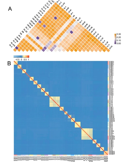 通過計(jì)算品種兩兩之間的Fst值與構(gòu)建遺傳距離矩陣,研究進(jìn)一步明確了油茶品種間的遺傳分化程度和親緣關(guān)系(Figure 5)。Fst值的分析結(jié)果顯示,長林CL-4、達(dá)林DL-1與湘林XL-1三者之間的Fst值極低(0.0106–0.0110),這表明這些品種可能源自相同或相似的遺傳背景。類似地,川榮CR-153與湘林XL-3、湘林XL-210之間的Fst值也表現(xiàn)出較高的遺傳相似性(0.0036–0.0442),提示這些品種可能具有共同的祖源關(guān)系。相比之下,達(dá)林DL-22與川榮CR-50(0.0816)、川榮CR-55(0.0870)和達(dá)林DL-1(0.0759)之間的Fst值較高,顯示出較為顯著的遺傳分化,反映其與這些品種的親緣關(guān)系較為緊密,但仍保持一定的遺傳獨(dú)特性。其它品種的Fst值范圍從0.1013到0.2908,表明這些品種的遺傳起源更加多樣,可能涉及不同的地理區(qū)域或品種間的較大差異(Figure 5A)。研究人員進(jìn)一步使用GCTA軟件計(jì)算的G矩陣分析,結(jié)果顯示大多數(shù)油茶品種之間的親緣關(guān)系較為明顯,遺傳分化較大(Figure 5B)。然而,一些品種群體的親緣關(guān)系值相似,例如XL-1、CL-4與DL-1;CR-153、XL-3與XL-210;華碩HS與華鑫HX,表明這些品種可能源自相同或相近的祖先背景。與此不同,達(dá)林DL-22品種在其群體內(nèi)部未顯示出顯著的親緣關(guān)系,反映出其群體內(nèi)存在較高的遺傳分化??傮w而言,這些分析為理解油茶品種的遺傳背景和親緣結(jié)構(gòu)提供了重要依據(jù),揭示了不同品種之間的親緣關(guān)系及其遺傳多樣性。
