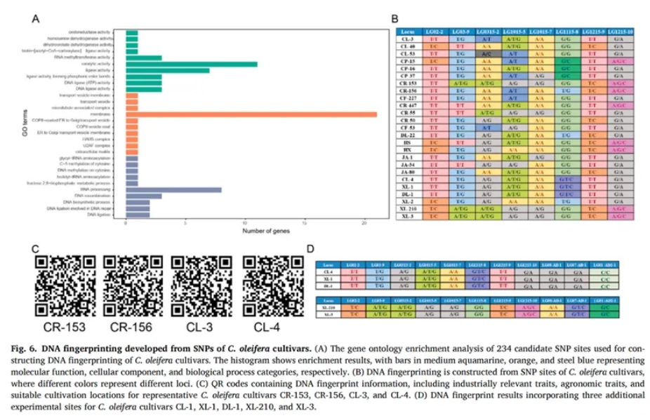 為建立油茶品種的快速鑒定體系,研究人員進(jìn)一步構(gòu)建了25個(gè)主栽油茶品種的DNA指紋圖譜(Figure 6)。在初步獲得的234個(gè)候選SNP中,有196個(gè)位點(diǎn)被注釋為功能明確的編碼區(qū)域突變,富集于DNA連接、RNA加工、果糖代謝等重要通路(Figure 6A)。為提升區(qū)分效率,進(jìn)一步篩除掉存在多變異干擾或功能不明的位點(diǎn),最終篩選得到15個(gè)核心SNP位點(diǎn),可有效區(qū)分全部25個(gè)油茶品種,實(shí)現(xiàn)穩(wěn)定的遺傳身份標(biāo)識(shí)。為確保指紋圖譜的準(zhǔn)確性與應(yīng)用價(jià)值,研究通過Sanger測(cè)序?qū)?5個(gè)候選SNP位點(diǎn)進(jìn)行了引物驗(yàn)證,最終篩選出8個(gè)多態(tài)性強(qiáng)、峰型清晰的核心SNP位點(diǎn)用于構(gòu)建指紋圖譜(Figure 6B)。這些位點(diǎn)主要分布于功能基因區(qū),涉及次生代謝、胚胎發(fā)育、自噬調(diào)控等關(guān)鍵生物過程,如編碼α-萜品醇合酶的LG12_G02320和控制胚胎發(fā)育與芽形成的FLA8蛋白基因LG03_G02445等,展現(xiàn)出良好的應(yīng)用潛力。為進(jìn)一步提升指紋信息的實(shí)用性,研究人員還開發(fā)了包含8個(gè)位點(diǎn)基因型信息的二維碼系統(tǒng),其中涵蓋了油脂品質(zhì)、農(nóng)藝性狀及適宜種植區(qū)域等數(shù)據(jù),為油茶品種的數(shù)字化管理與選育決策提供便捷、高效的技術(shù)支持(Figure 6C)。二維碼系統(tǒng)為油茶品種的數(shù)字化管理與選育決策提供了便捷、高效的技術(shù)支持。通過將分子標(biāo)記信息與油茶生產(chǎn)應(yīng)用相結(jié)合,研究成果不僅實(shí)現(xiàn)了分類識(shí)別功能,還為分子育種提供了重要參考價(jià)值。