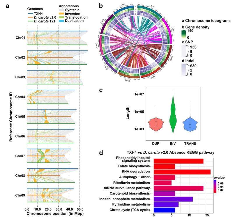 該研究成功組裝了TXH4的T2T無(wú)間隙基因組。與兩個(gè)橙色胡蘿卜參考基因組(黑田型、南特型)比較,分別鑒定出2,466,422和2,037,986個(gè)SNP,以及500,579和474,704個(gè)InDel。更重要的是,KEGG通路分析發(fā)現(xiàn),類胡蘿卜素生物合成通路中的基因富集了大量TXH4的特異性變異,初步揭示了紅色類胡蘿卜素的積累模式與南特、黑田五寸等橙色胡蘿卜存在顯著差異。