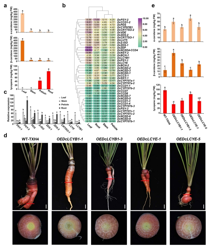 功能實(shí)驗(yàn)為上述關(guān)聯(lián)提供了因果證據(jù)。在TXH4中過(guò)表達(dá)DcLCYB1和DcLCYE,導(dǎo)致根中番茄紅素含量下降;相反,在橙色胡蘿卜(黑田型)中敲除這兩個(gè)基因,則成功誘導(dǎo)了番茄紅素的大量積累。這直接證明,DcLCYB1和DcLCYE的低表達(dá)是TXH4番茄紅素特異性高水平積累的核心機(jī)制。它們的表達(dá)抑制,阻斷了番茄紅素向α/β-胡蘿卜素的轉(zhuǎn)化通路,從而使其在根中大量富集。