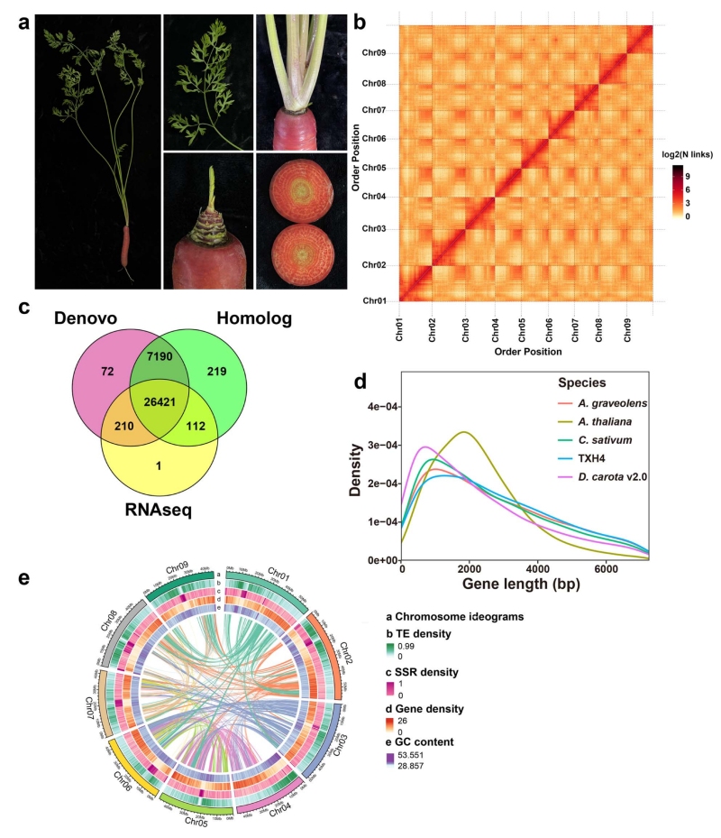 為解析上述科學(xué)問題,研究團(tuán)隊(duì)選取紅色胡蘿卜高代自交系TXH4為材料,采用了前沿的多平臺(tái)測(cè)序技術(shù)進(jìn)行無(wú)間隙的端粒到端粒(T2T)基因組組裝。