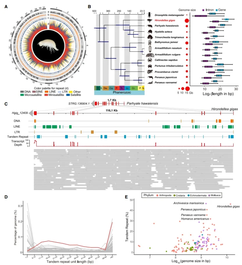 研究團(tuán)隊(duì)利用PacBio?HiFi長(zhǎng)讀長(zhǎng)測(cè)序和Hi-C三維基因組技術(shù),成功組裝了H.?gigas的染色體水平的高質(zhì)量基因組(大小13.92?Gb)?;蚪M分析揭示了其兩大主要特征:內(nèi)含子延長(zhǎng)和重復(fù)序列擴(kuò)張。與近緣物種相比,H.?gigas的內(nèi)含子長(zhǎng)度顯著增加,主要是由于重復(fù)序列的插入,尤其是串聯(lián)重復(fù)和長(zhǎng)散在重復(fù)序列(LINEs)轉(zhuǎn)座子。H.?gigas基因組中71.98%為重復(fù)序列,主要為串聯(lián)重復(fù),占到基因組的46.03%,顯著高于其他無(wú)脊椎動(dòng)物。特別是,與其他無(wú)脊椎動(dòng)物基因組相比,H.?gigas基因組中長(zhǎng)單元串聯(lián)重復(fù)序列(小衛(wèi)星,10-100?bp)的比例更高,其比例與無(wú)脊椎動(dòng)物基因組大小正相關(guān)。這些重復(fù)的產(chǎn)生可能與深淵極端環(huán)境的適應(yīng)有關(guān)。