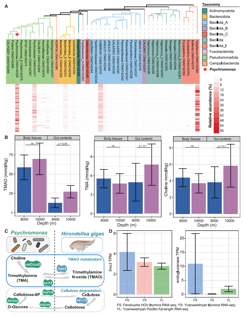 氧化三甲胺(TMAO)是一種滲透調(diào)節(jié)物質(zhì),在滲透壓調(diào)節(jié)以及在高靜水壓條件下維持細(xì)胞完整性方面發(fā)揮著重要作用。檢測(cè)發(fā)現(xiàn),隨著深度增加,鉤蝦腸道內(nèi)容物中TMAO濃度顯著升高,體組織中也呈現(xiàn)類似趨勢(shì)。鉤蝦自身編碼fmo3基因,可將三甲胺(TMA)轉(zhuǎn)化為T(mén)MAO。而其優(yōu)勢(shì)共生菌Psychomonas的基因組中攜帶cutC和cutD基因簇,可將膽堿分解為T(mén)MA;同時(shí)擁有torYZ操縱子,可以將TMAO還原為T(mén)MA,從而調(diào)控宿主體內(nèi)的TMAO濃度,形成動(dòng)態(tài)平衡。