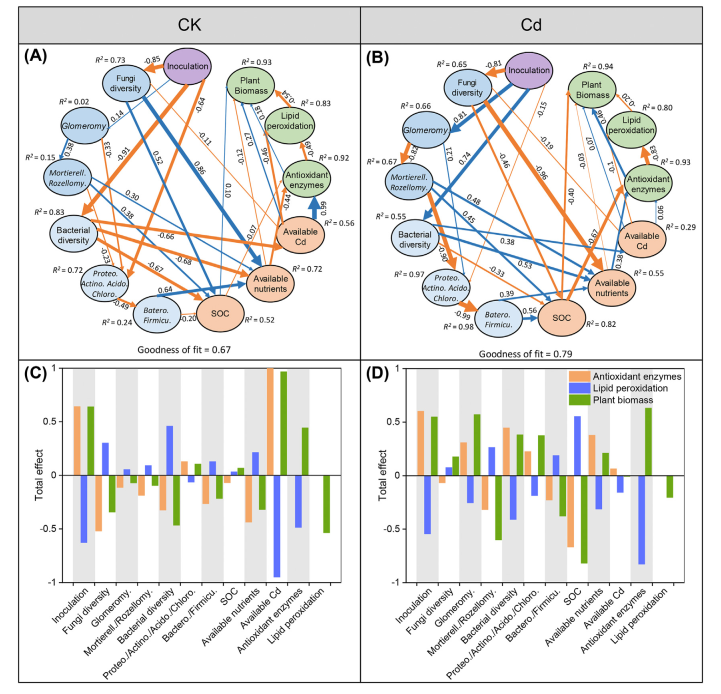 圖5 處理(接種和添加Cd)與微生物群落、土壤特性和植物抗性的級聯(lián)關(guān)系。偏最小二乘路徑模型(PLS-PM)剖析了處理、微生物群落和土壤特性對植物抗性的主要影響途徑(A)(B);以及每個變量對植物生物量、抗氧化酶和脂質(zhì)過氧化物的總影響(C)(D)。