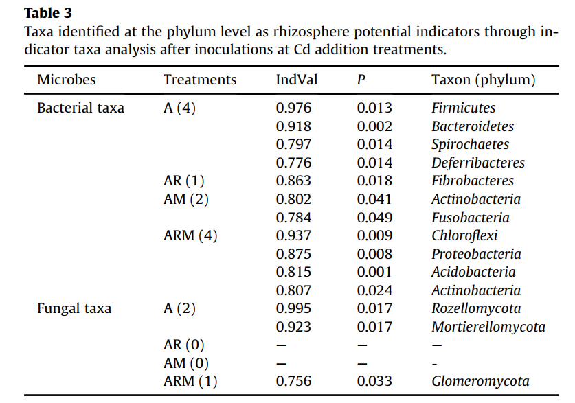 我們的研究在所有不同的處理中檢測到了10個真菌門類(相對豐度>1%),即子囊菌門(Ascomycota)、Unclassified、擔(dān)子菌門(Basidiomycota)、球囊菌門(Glomeromycota)、被孢霉門(Mortierellomycota)、壺菌門(Chytridiomycota)、毛霉門(Mucoromycota)、尾蟲門(Cercozoa)、油壺菌門(Olpidiomycota)和羅茲菌門(Rozellomycota) (圖2B)。在所有處理中,占主導(dǎo)地位的真菌門為Ascomycota(44.3-65.7%)和Unclassified(14.9-36.6%)。Cd的添加顯著影響了Cercozoa和Rozellomycota的相對豐度,接種后極大地影響了Glomeromycota、Mortierellomycota和Rozellomycota的相對豐度(P <0.05)。其他菌類在真菌群落組成中只占很小的一部分,如Basidiomycota和Glomeromycota。同時,對指示菌種的分析表明,從門到科水平的這些細(xì)菌類群(Proteobacteria、Actinobacteria、Acidobacteria、Chloroflexi、Bacteroidetes和Firmicutes)和真菌類群(Glomeromycota、Mortierellomycota和Rozellomycota)都是根瘤菌和AMF共同接種后根際微生物群落的主要指標(biāo)(表3)。