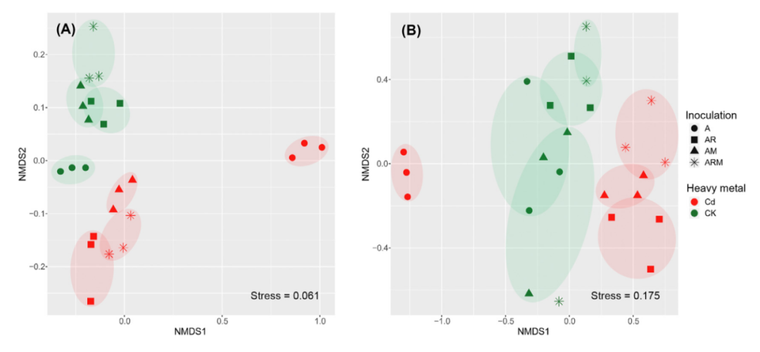 研究接種根瘤菌和AMF對苜??规k(Cd)脅迫的影響,利用16S和ITS rRNA基因的高通量測序,進(jìn)一步分析了根際微生物群落接種后的響應(yīng)及其在提高紫花苜蓿抗性方面的作用。