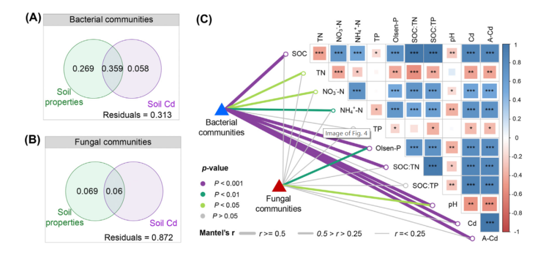 Pearson相關(guān)分析發(fā)現(xiàn),Cd、OTU和細(xì)菌群落的α多樣性指數(shù)(即Shannon、Simpson、Chao1和ACE)之間存在顯著的相關(guān)性(P<0.05)。除Shannon指數(shù)外,SOC、TN、SOC:TN和SOC:TP與OUT以及細(xì)菌群落中的這些α多樣性指數(shù)之間存在顯著的相關(guān)性。但是,除了真菌群落的OTU和Shannon與SOC和SOC:TN外,真菌群落的α多樣性指數(shù)與這些土壤性質(zhì)之間沒有發(fā)現(xiàn)明顯的相關(guān)性。