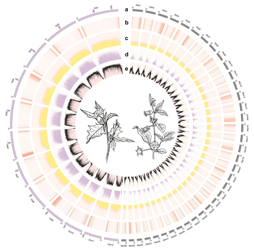 本研究基于三代PacBio、Nanopore、Hi-C等技術(shù)成功構(gòu)建了2個具有代表性的產(chǎn)mTAs的物種:顛茄和曼陀羅染色體水平基因組。研究結(jié)果表明:它們在茄科中的親緣關(guān)系較遠(yuǎn),但這兩個物種產(chǎn)生mTAs的生物合成途徑是保守的。保守的基因簇和基因重復(fù)構(gòu)成了TAs在該科中廣泛分布的基礎(chǔ),導(dǎo)致mTAs的分支基因可能在茄科早期祖先物種中進(jìn)化,但在大多數(shù)譜系中都已丟失,顏茄和曼陀羅是例外。此外,研究還鑒定了一種細(xì)胞色素P450,它能將莨若堿修飾成去甲莨菪堿。此研究結(jié)果為了解茄科植物中TAs的生物合成提供了基因組學(xué)基礎(chǔ),并將有助于通過合成生物學(xué)方法進(jìn)行mTAs的生物技術(shù)生產(chǎn)。
