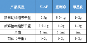 建議送樣量適用于95%的物種組織,少部分組織因胞內(nèi)核酸量較低,需適當(dāng)增加送樣量,比如植物果實(shí)、根等。送樣量過少或過多均不利于提取實(shí)驗(yàn),下限為建議量的一半,上限為建議量的3倍。隨著技術(shù)發(fā)展,當(dāng)前大部分產(chǎn)品建庫起始量較低,不需要太多組織,采樣量過多反而會(huì)造成速凍不徹底、提取取樣困難、凍融降解等危險(xiǎn)。