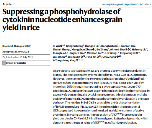 作者通過秈稻品種特青和粳稻品種02428構(gòu)建高級遺傳群體克隆了產(chǎn)量相關(guān)基因GY3,其啟動(dòng)子區(qū)域的反轉(zhuǎn)座子插入增強(qiáng)了啟動(dòng)子區(qū)域的表觀修飾,降低GY3表達(dá)量,從而減少細(xì)胞分裂素合成前體底物的無效消耗,提高體內(nèi)活性的細(xì)胞分裂素含量,增加每穗粒數(shù)和谷物產(chǎn)量。GY3可作為后期秈稻高產(chǎn)育種的重要目標(biāo)基因,推動(dòng)產(chǎn)量提升。