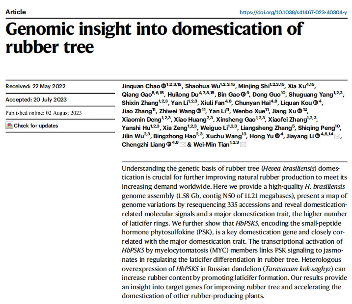 作者利用PacBio CLR+BioNano+Hi-C的方法構(gòu)建了橡膠樹參考基因組,結(jié)合127個(gè)栽培和208個(gè)野生品種重測序數(shù)據(jù)對其馴化的分子機(jī)制解析,同時(shí)通過208份橡膠樹種質(zhì)材料進(jìn)行GWAS分析,鑒定到一個(gè)調(diào)控乳管數(shù)量的馴化基因。此研究將為后期橡膠樹的高產(chǎn)育種提供了分子基礎(chǔ)。
