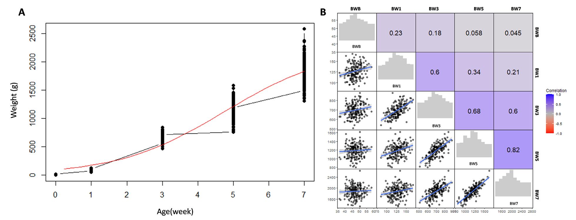 該研究對金陵白鴨(n = 201)在不同時(shí)期的體重進(jìn)行統(tǒng)計(jì),BWB、BW1、BW3、BW5和BW7的體重均值分別為46.93g、127.19g、697.17g、1182.43g和1,888.52g。生長曲線結(jié)果顯示:金陵白鴨第3周-第5周生長最快,第5周后生長放緩。體重的分散度隨著年齡和體重的增加而增加。相鄰2周的體重之間存在較強(qiáng)的相關(guān)性,BW3與BW1(r = 0.6)、BW5(r = 0.68)和BW7(r = 0.6)顯著正相關(guān),BW5與BW7顯著正相關(guān)(r = 0.82)。但隨著時(shí)間間隔的延長,性狀間的相關(guān)性降低,BW1與BW7的相關(guān)性不顯著(r = 0.21),BWB則與BW3 (r = 0.18), BW5 (r = 0.058),BW7 (r = 0.45)均不顯著相關(guān)。