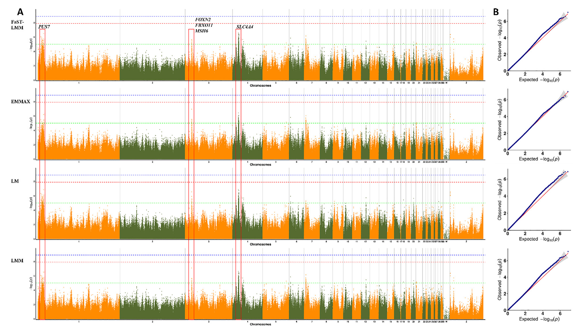 作者對出生體重(BWB)、1周體重(BW1)、3周體重(BW3)、5周體重(BW5)和7周體重(BW7)進(jìn)行了全基因組關(guān)聯(lián)分析,4種統(tǒng)計(jì)模型比較研究表明,F(xiàn)aST-LMM表現(xiàn)出最優(yōu)的效率,產(chǎn)生更多的結(jié)果和最小的假陽性。