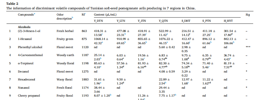 7個(gè)產(chǎn)區(qū)突尼斯軟籽石榴揮發(fā)性化合物的熱圖:風(fēng)味譜、糖、有機(jī)酸和維生素c含量存在顯著差異。所有石榴花粒中共鑒定出40種揮發(fā)性化合物,其中醇、醛、酸和二戊烯是影響石榴香氣品質(zhì)主要因素。