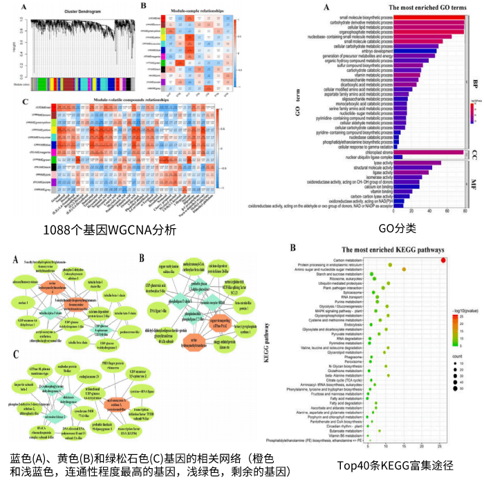 GO和KEGG富集;1808基因主要富集于分子功能的“裂解酶活性”,細(xì)胞成分的“葉綠體基質(zhì)”,生物過程的“小分子生物合成過程”。鑒定了40條顯著富集的KEGG途徑,其中碳代謝生物合成的DGE數(shù)量最多。與其他次生代謝產(chǎn)物相關(guān)的途徑也被富集,包括淀粉和蔗糖代謝、糖酵解/糖異生等,這些富集的基因大部分屬于黃色、綠松石色和藍(lán)色模塊。這也表明,這些模塊中的基因的功能與KEGG富集分析相一致,而KEGG富集分析主要與初級和次生代謝產(chǎn)物的合成和代謝有關(guān)。