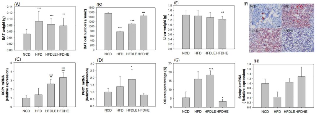 NLE未能顯著降低HFD導致的BAT增長(圖2A),與脂肪代謝有關的UCP1和PGC1基因表達在HFD-LE組中顯著升高(圖2C-2D),HFD-HE顯著降低了肝重(圖2E),NLE對HFD誘導的脂肪增生具有有效的抑制作用(圖2F-2G)。Srebp1c與肝脂肪的變性有關,NLE對HFD導致的Srebp1c基因表達水平降低有恢復作用(圖2H)。
