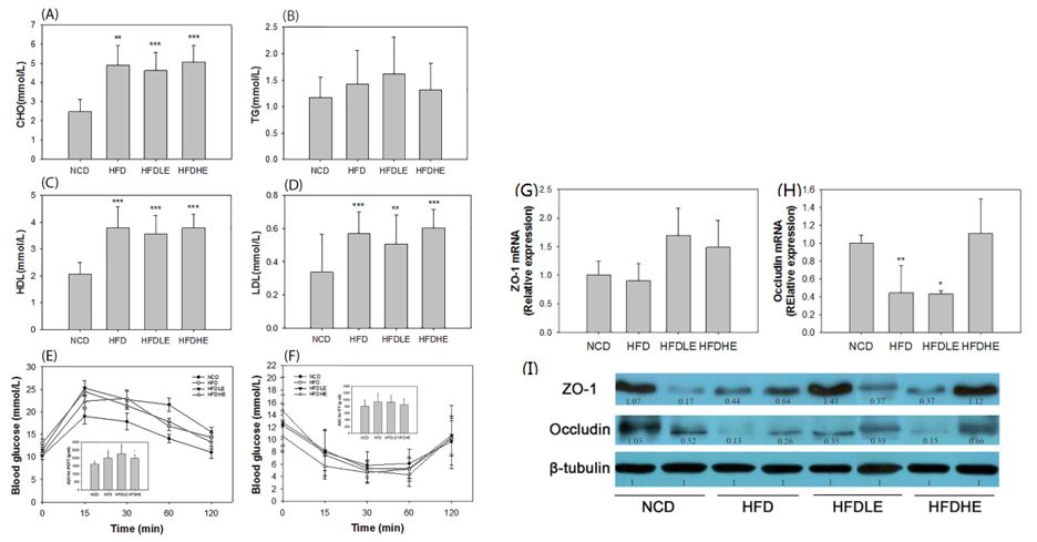 HFD-LE組、HFD-HE組均未顯著降低HFD導致的小鼠血清CHO、TG、LDL和HDL的升高(圖3A-3D)。緊密連接蛋白(ZO-1)和閉合蛋白是腸道上皮和屏障功能完整的重要生物標志物,其表達的減少顯著細胞外通透性增加。高濃度的NLE(HFD-HE組)顯著恢復了HFD造成的閉合蛋白基因mRNA轉(zhuǎn)錄的降低(圖3H)。NLE對閉合蛋白基因表達影響的劑量依賴性在West Blot試驗中也有體現(xiàn)(圖3I)。