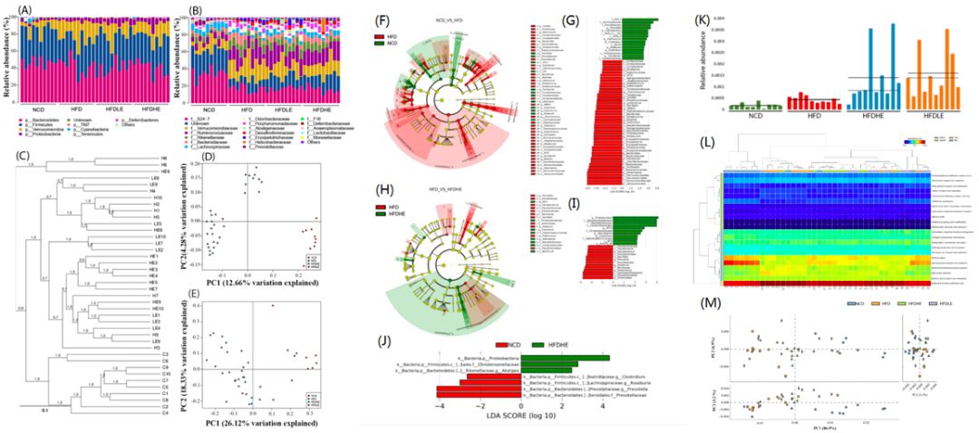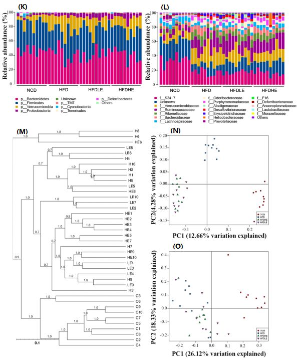 HFD導致小鼠腸道菌群的多樣性降低,然而NLE恢復了菌群多樣性(圖4)。Proteobacteria?、Epsilonproteobacteria、Helicobacteraceae?和Campylobacterales在HFD-HE組顯著富集(圖5H;5I),NCD與HFD-HE組的菌群結(jié)構差異較小(圖5J), NLE提高了HFD-HE和HFD-LE組Campylobacterales的豐度(圖5K)。NLE恢復了部分HFD導致的[K]轉(zhuǎn)錄和[G]碳水化合物代謝與運輸?shù)墓δ茴愋停▓D5L)。