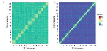 本研究使用Illumina HiSeq和PacBio Sequel測(cè)序平臺(tái),用Hi-C、光學(xué)(BioNano Irys)和遺傳圖譜輔助,進(jìn)行雌性構(gòu)樹(shù)的基因組組裝。獲得染色體水平的高質(zhì)量構(gòu)樹(shù)基因組,其大小為386.93Mb,scaffold N50是29.48Mb,有99.25%(357.56Mb)的基因組被錨定在13條染色體上,Hi-C熱圖評(píng)估(見(jiàn)圖1)。一共預(yù)測(cè)了30,512個(gè)基因,98.09%與已知基因同源并且得到了功能上的注釋。