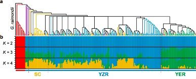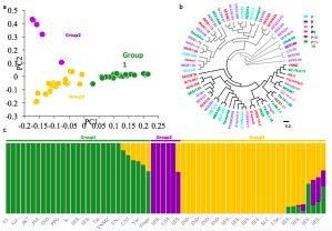 研究中對(duì)世界種質(zhì)資源庫(kù)的64份S. spontaneum材料進(jìn)行重測(cè)序,發(fā)現(xiàn)其核苷酸多態(tài)性(π)[0.00021±0.000002 ]遠(yuǎn)遠(yuǎn)低于其它克隆繁殖的作物,如馬鈴薯,木薯,葡萄和柑。通過(guò)PCA主成分分析及群體結(jié)構(gòu)分析發(fā)現(xiàn)64份材料分為3個(gè)群,這些群體也受到自然和地理起源推斷的64份種質(zhì)的系統(tǒng)發(fā)育關(guān)系的支持(見(jiàn)圖3),group1來(lái)源于菲律賓,印度尼西亞和巴布亞新幾內(nèi)亞;group2和group3來(lái)源于印度,巴基斯坦和伊朗?;蚪M倍性在三組中差異很大(從6x-16x)。通過(guò)系統(tǒng)進(jìn)化分析發(fā)現(xiàn),表明不同的倍性可能是從祖先獨(dú)立進(jìn)化而來(lái)的。
