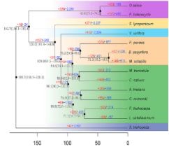 比較基因組分析:直系同源基因鑒定:?OrthoMCL (version 2.0);系統(tǒng)發(fā)育樹(shù)構(gòu)建與分化時(shí)間估算:?MUSCLE、Gblocks (version 0.91b)和RaxML(version 8),MCMCTREE評(píng)估分化時(shí)間;基因家族擴(kuò)張和收縮分析:CAFE(vertion 3.1);染色體共線(xiàn)性分析、4DTV檢測(cè)及Ks值計(jì)算:MCscan。