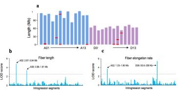 由陸地棉Emian22作為受體親本,海島棉3-79作為供體親本構(gòu)建包含168個(gè)個(gè)體的CSSLs群體,旨在引入有利的變異,如纖維質(zhì)量。QTL定位分析,共鑒定到5個(gè)性狀的13個(gè)QTLs位點(diǎn),其中控制纖維長(zhǎng)度位點(diǎn)2個(gè),控制纖維強(qiáng)度位點(diǎn)4個(gè),馬克隆值位點(diǎn)2個(gè),纖維伸長(zhǎng)率位點(diǎn)2個(gè),纖維均勻度位點(diǎn)3個(gè)(圖3)。在這些QTLs位點(diǎn)中,9個(gè)位點(diǎn)之前未被鑒定出,通過(guò)檢驗(yàn)13個(gè)QTLs中的基因表達(dá)水平,研究人員檢測(cè)到了235個(gè)在纖維發(fā)育過(guò)程中高度表達(dá)的基因,同時(shí)還整合了基因組變異數(shù)據(jù)來(lái)預(yù)測(cè)候選基因,而這些基因值得進(jìn)一步進(jìn)行精細(xì)定位以確認(rèn)對(duì)這些性狀具有重要影響的基因。