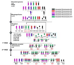 AP85-441基因組的組裝顯示了S. spontaneum的染色體數(shù)目從10降到8,而這與頻繁復(fù)制的古復(fù)制染色體對(duì)相關(guān),通過(guò)與高粱的聚類(lèi)比對(duì),發(fā)現(xiàn)高粱祖先5號(hào)染色體和8號(hào)染色體同源物經(jīng)歷了染色體裂變(見(jiàn)圖2)。SbChr05(A12)的祖先染色體斷裂分為兩個(gè)主要部分,即C5S(A12S)和C5L(A12L),分別轉(zhuǎn)移到SbChr06(A2)和SbChr07(A5)的祖先染色體;SbChr8(A11)的祖先染色體斷裂為兩個(gè)主要的部分,即C8S(A11S)和C8L(A11L),分別轉(zhuǎn)移到SbChr09(A6)和SbChr02(A7 + A9)的祖先染色體中。SbChr8和SsChr5之間及SbChr5和SsChr7之間近乎同源的短片段是在高粱與甘蔗分化前,高粱SSA形成于13.4 MYA同源基因的殘留物,同時(shí)發(fā)現(xiàn),S5中較小的SSA區(qū)域和S8中SSA的較大區(qū)域在重排的AP85-441基因組中也是保守的。