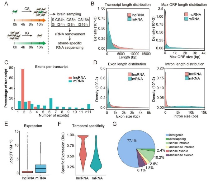 研究發(fā)現(xiàn)大約78%的lncRNA包含2個(gè)外顯子,而mRNA中包含的外顯子數(shù)量為1至120(圖1C)。因此,lncRNA的外顯子明顯長(zhǎng)于mRNA的外顯子(平均長(zhǎng)度1142bpvs.263bp,圖1D,左)。同時(shí),lncRNA的內(nèi)含子明顯短于mRNA的內(nèi)含子(平均長(zhǎng)度:10086bpvs.12442bp,圖1D,右)。表達(dá)水平分析表明,lncRNA的總體表達(dá)水平明顯低于mRNA的表達(dá)水平(平均值為0.6vs.1.9;圖1E)。但是,表達(dá)特異性分析表明,lncRNA的表達(dá)受時(shí)間限制的程度要高于mRNA(平均值為0.672對(duì)0.436圖1F)?;谙鄬?duì)于mRNA的lncRNA基因組位置,蝗蟲(chóng)lncRNA被分類為基因間、重疊區(qū)、有義內(nèi)含子、反義內(nèi)含子、有義外顯子和反義外顯子。蝗蟲(chóng)77%以上的lncRNA是長(zhǎng)基因間的ncRNA(lincRNA,圖1G)。這些結(jié)果表明,蝗蟲(chóng)lncRNA與mRNA在結(jié)構(gòu)和表達(dá)上有很大不同?;认x(chóng)lncRNAs更長(zhǎng),具有更少但更長(zhǎng)的外顯子和更短的內(nèi)含子。此外,lncRNA的表達(dá)模式顯示出比mRNA更高的時(shí)間特異性。